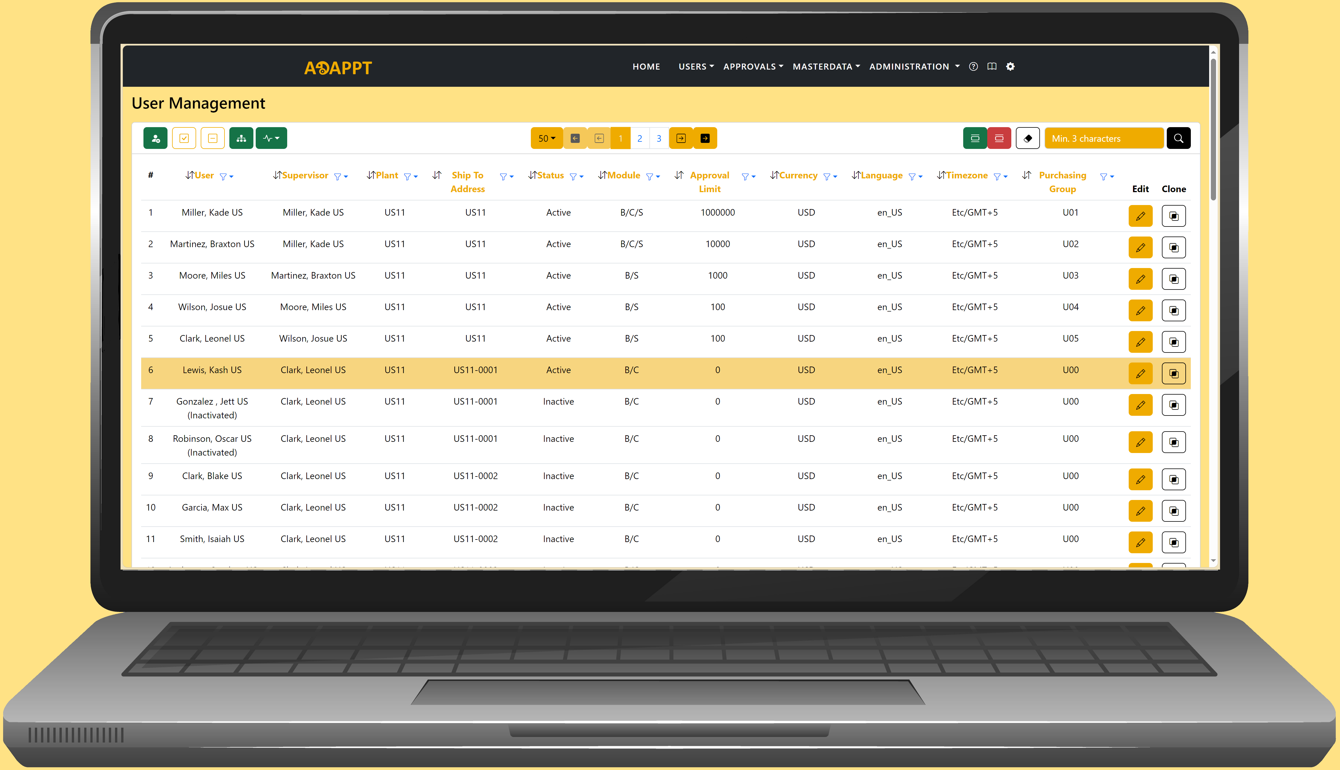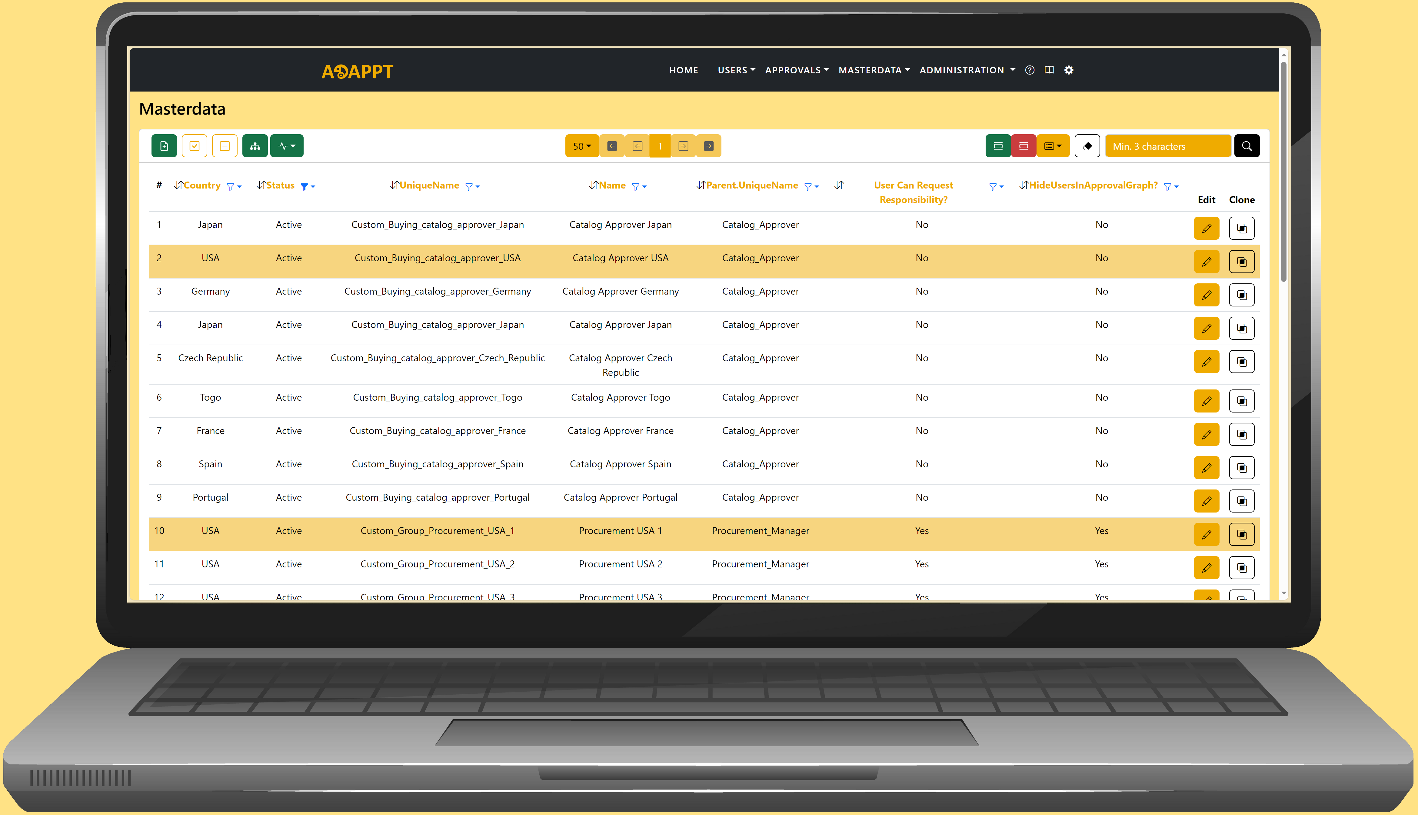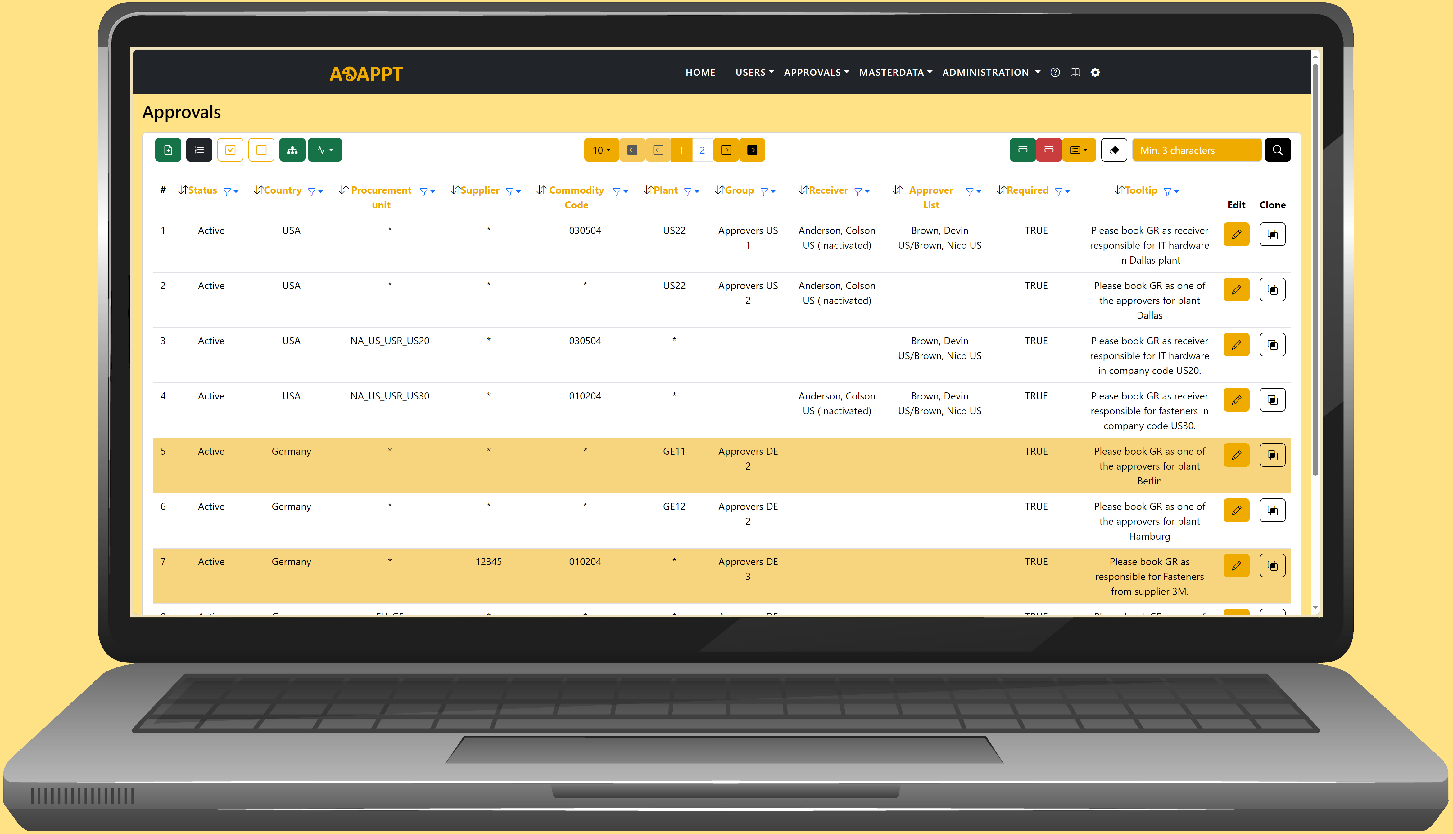 ADAPPTool admins are able to review and edit diverse approval lookup tables (requisitions, central goods receiving etc.). Their rights can be limited to certain type of approval table, geographical area etc.