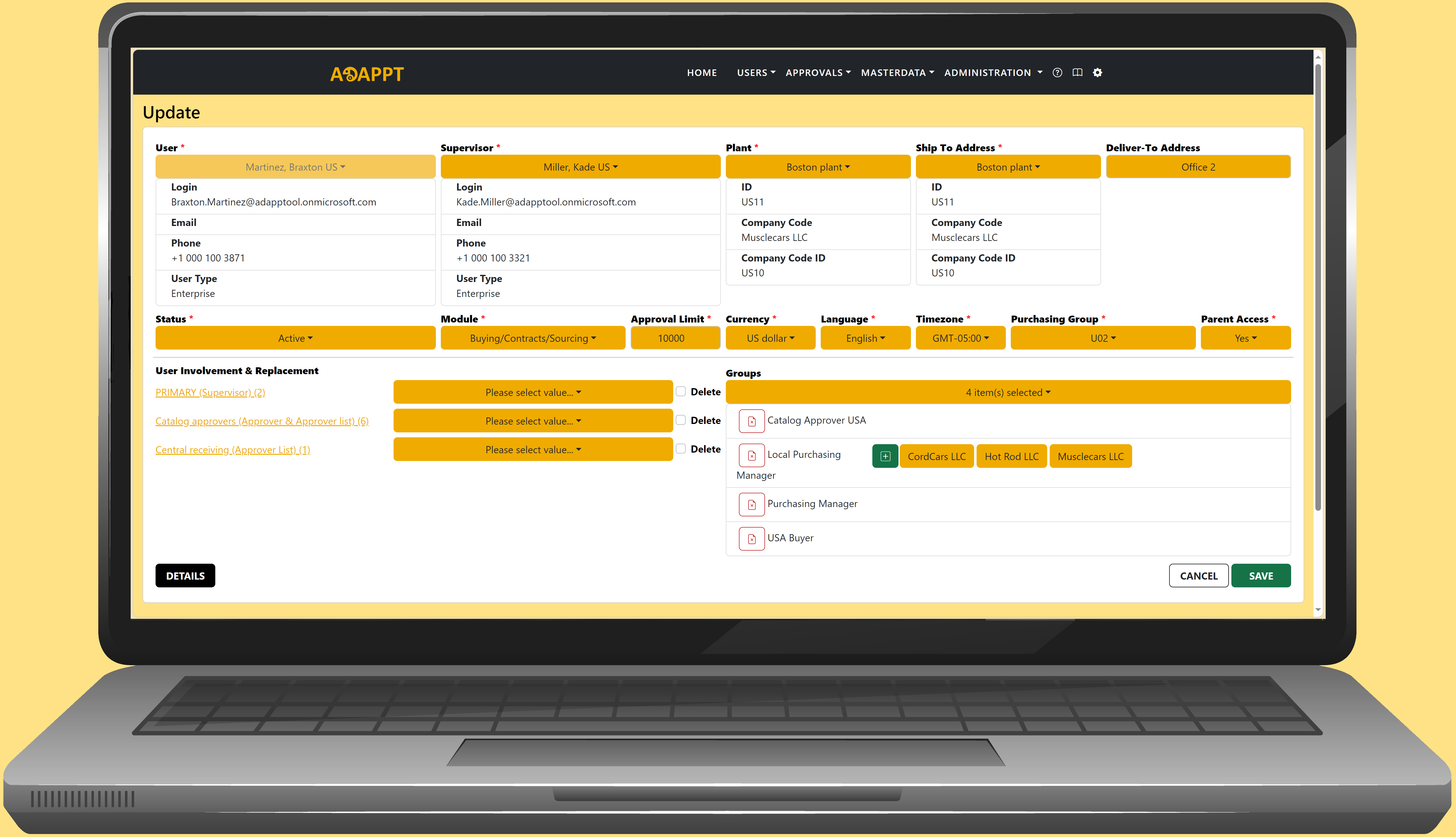 ADAPPTool contains three interlinked modules: User management, Approval tables and Master data maintenance. You can create new Ariba user and immediately use him in approval tables. When user leaves, replace him with just few clicks by another one as a supervisor or approver in any approval table. You can easily create custom groups and assign them to your users and much more.
